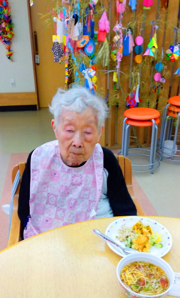 お誕生日会では手作りケーキ、七夕祭りにはそうめんと夏野菜のかき揚げを楽しみました。 短冊に書いた願い事 叶うといいなぁ!