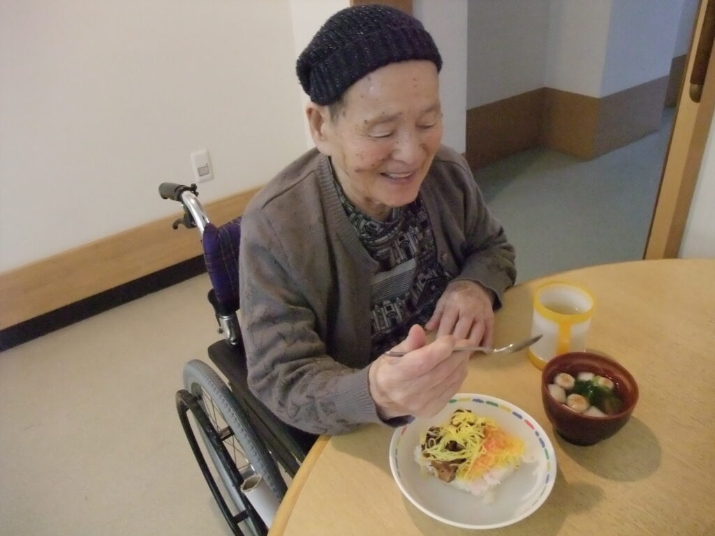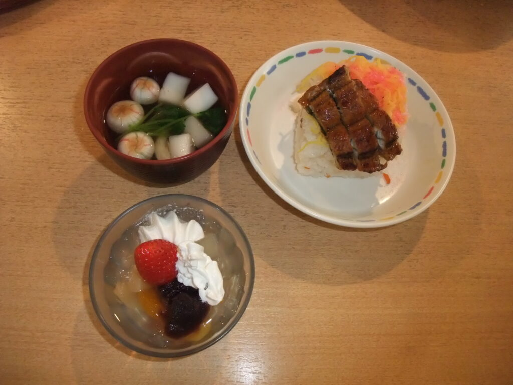 今回の昼食は、ちらし寿司、すまし汁、フルーツ寒天でした。